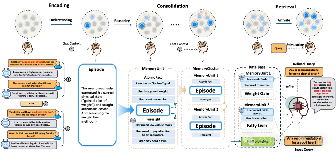 具体来讲,EverMemOS通过模拟人类记忆的形成并转化为计算框架,利用三阶段层层递进以实现大模型长期记忆的存储和提取: